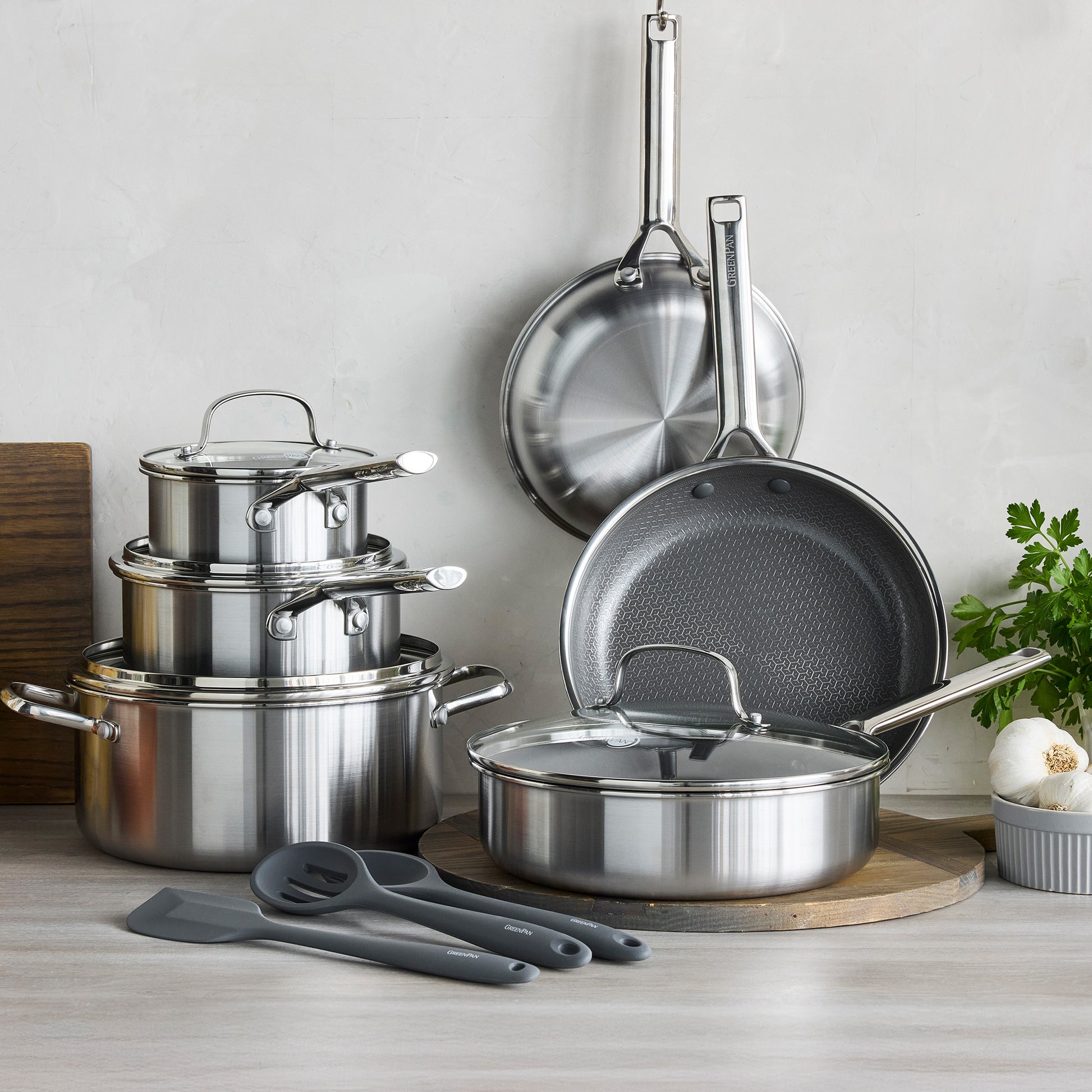 GreenPan APEX is een heruitvinding van hybride kookgerei. We combineren een krachtig geëtst patroon in roestvrij staal met onze kenmerkende PFAS-vrije antiaanbaklaag en voegen een boostlaag toe voor maximale prestaties. Ongelooflijke schroeiresultaten en moeiteloze loslating. Gemaakt van drielaags roestvrij staal is APEX vijf keer beter bestand tegen metalen keukengerei, ontworpen voor alle kookplaten en ovenbestendig tot 220 graden Celsius. Het is ook gemakkelijk schoon te maken. Ervaar de evolutie van hybride kookgerei met GreenPan.