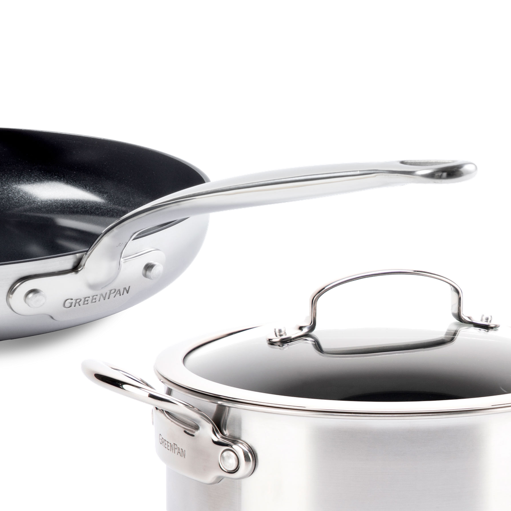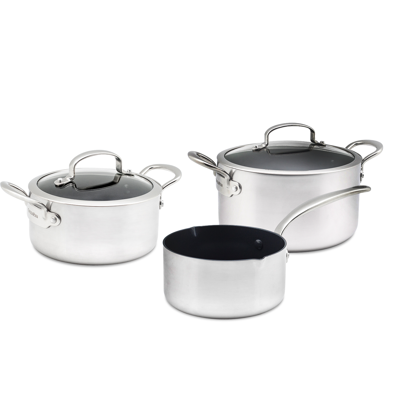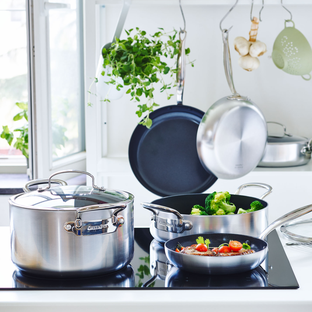 De luxueuze Barcelona Evershine collectie is knap om te zien en een plezier om mee te koken! Het ontwerp in 3-laags roestvrij staal met aluminium kern warmt snel en gelijkmatig op voor professionele resultaten. De Thermolon Infinity Pro keramische antikleeflaag is versterkt met diamant en bevat geen schadelijke stoffen (PFAS-vrij).