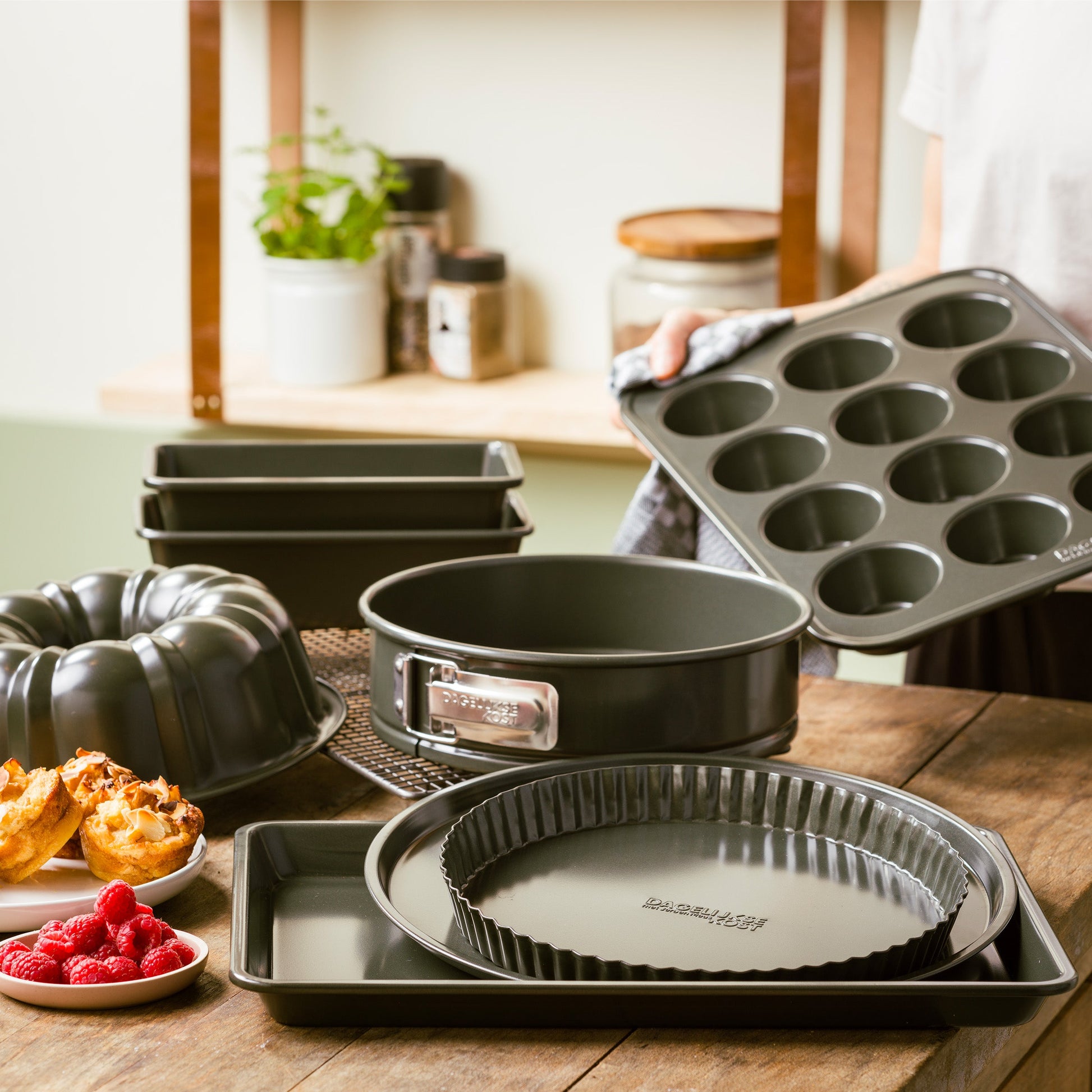 Met de bakvormen van Dagelijkse kost wordt bakken nóg plezanter! Ze zijn gemaakt van kwalitatief gealuminiseerd plaatstaal. Daardoor zijn ze extra stevig en warmen ze gelijkmatig op. Zo ben je zeker van perfecte bakresultaten. Dankzij de PFAS-vrije antikleeflaag aan de binnenkant blijft je baksel niet plakken en behoudt het zijn vorm. Nog een voordeel: schoonmaken is kinderspel! En ook het stijlvolle olijfgroene design mag er zijn. Mooi, duurzaam en makkelijk!