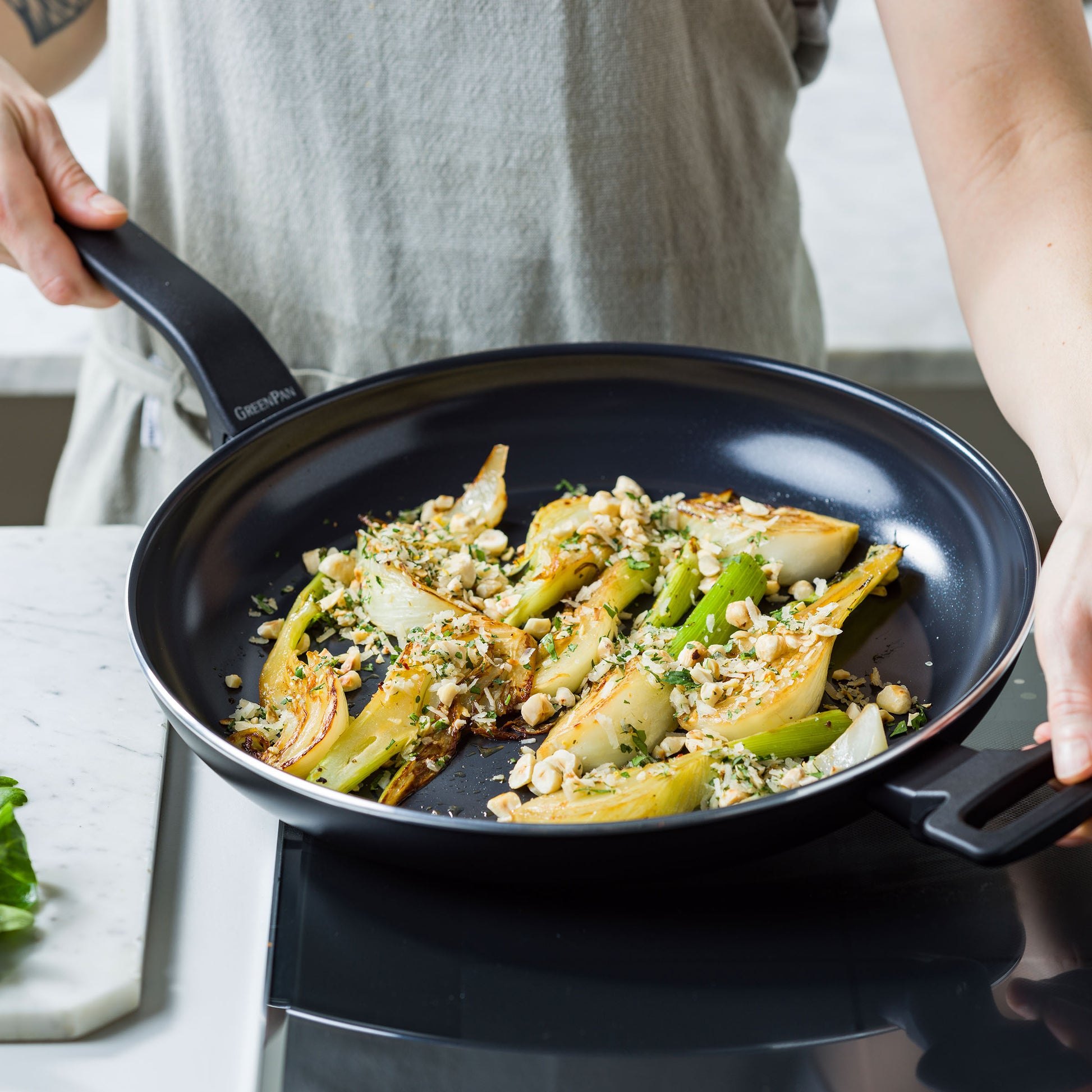 De body van de pan bevat minstens 65% gerecycleerd aluminium en warmt gelijkmatig op voor perfecte resultaten zonder veel moeite. De pan heeft bovendien een inductiebodem waardoor ze uitstekend werkt op elk fornuis.