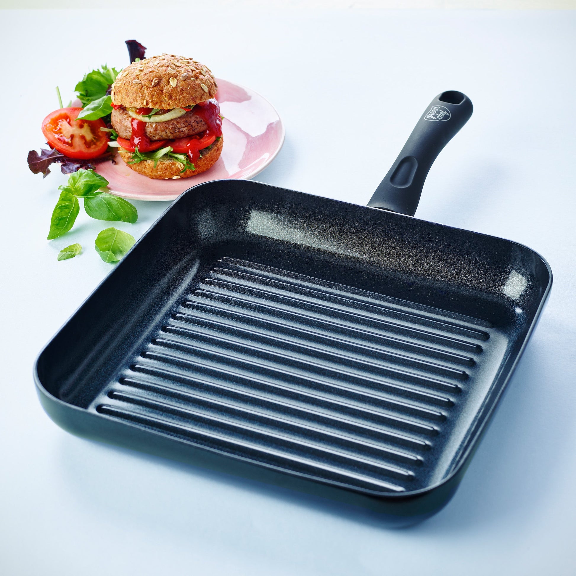 Deze pan is gemaakt van aluminium en warmt gelijkmatig op voor perfecte bakresultaten. Je kunt ze gebruiken op elk fornuis, ook inductie. De ergonomische stay-cool handgreep met duimafdruk zorgt voor een stevige en veilige grip.