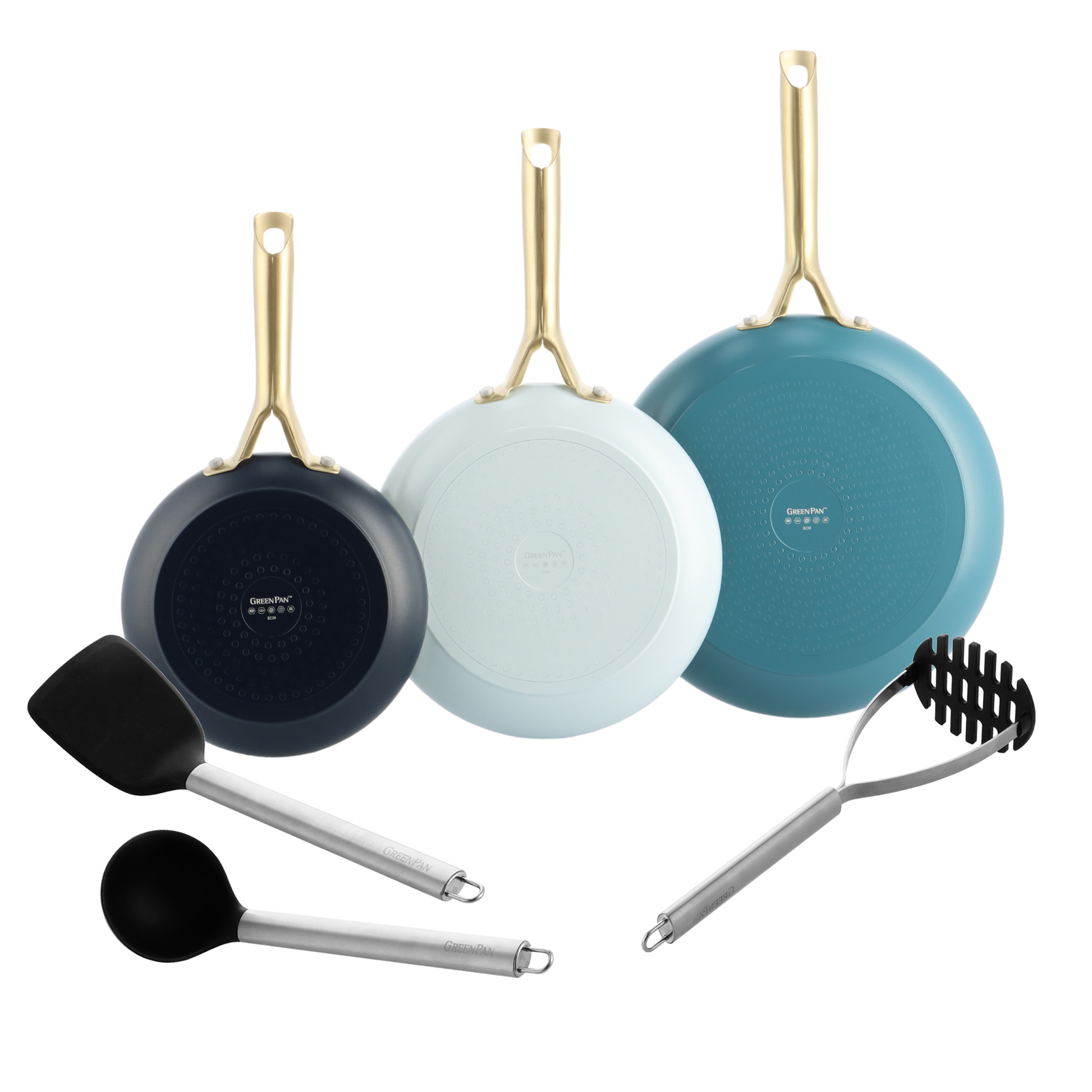 Deze driedelige set brengt harmonie en trendy kleuren naar je keuken, geïnspireerd door de natuur. De pannen zijn gemaakt van 100% gerecycled aluminium en voorzien van onze PFAS-vrije keramische antiaanbaklaag voor gezond koken. Dankzij de geperforeerde inductiebodem warmen ze gelijkmatig op en zijn ze bestand tegen dagelijks gebruik. De crèmekleurige binnenkant en champagnekleurige handgreep maken het design compleet.